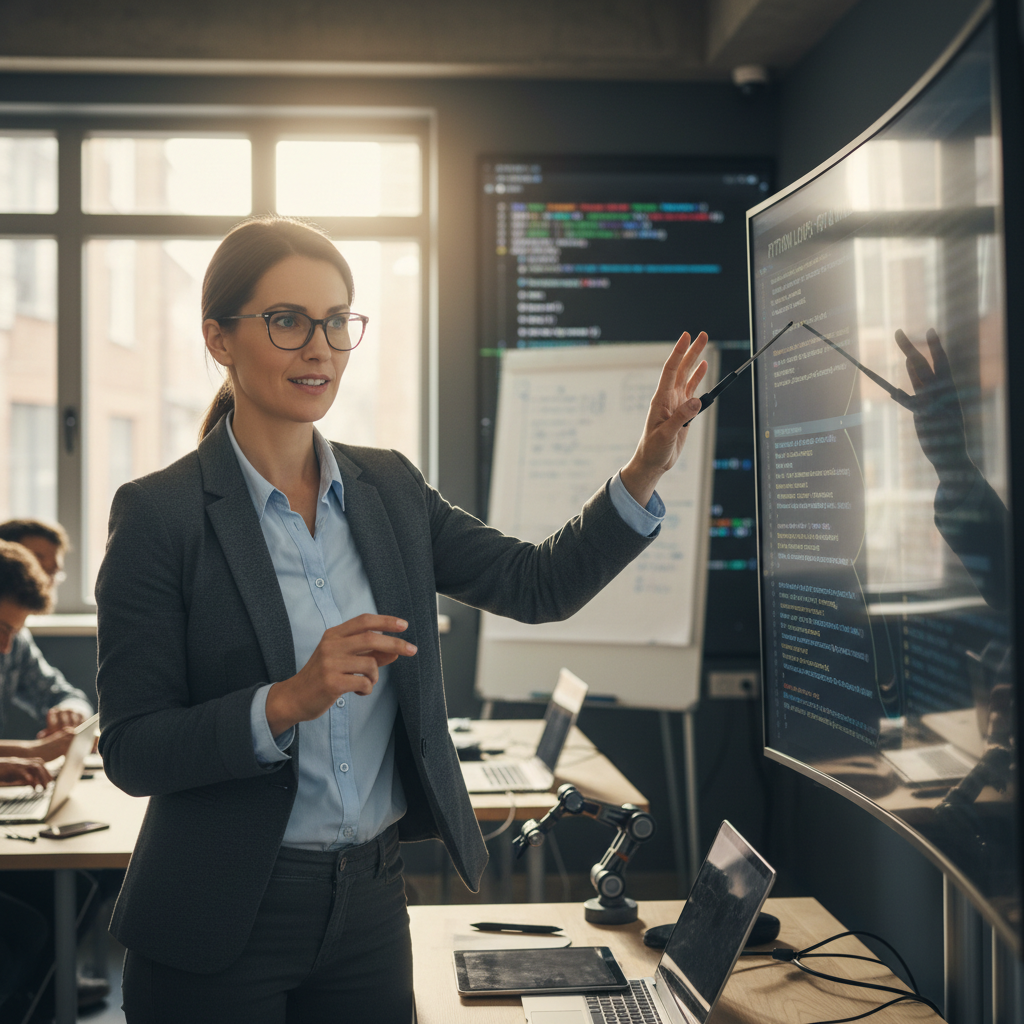 Crianças e educadores em sala de aula moderna com tecnologia e materiais educacionais sustentáveis