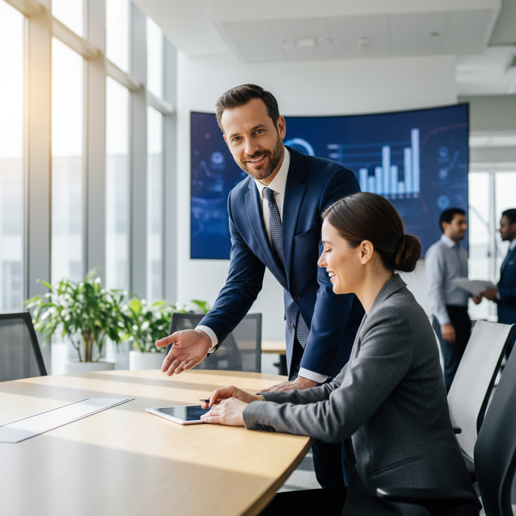 Equipe profissional analisando dados em telas digitais em escritório moderno com gráficos e métricas